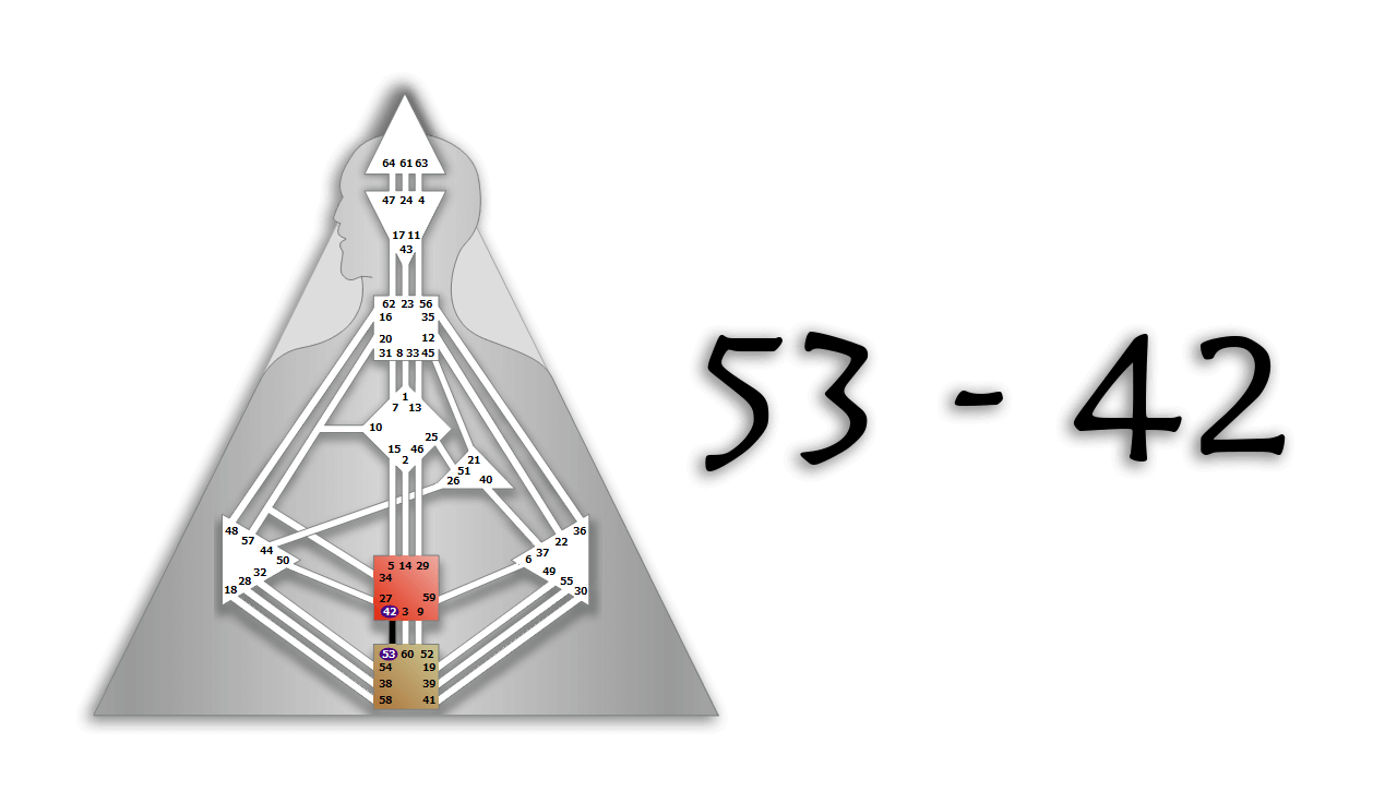 The Maturation Channel connects the Root Center to the Sacral Center through the Gate of Beginnings (53) and the Gate of Growth (42).
